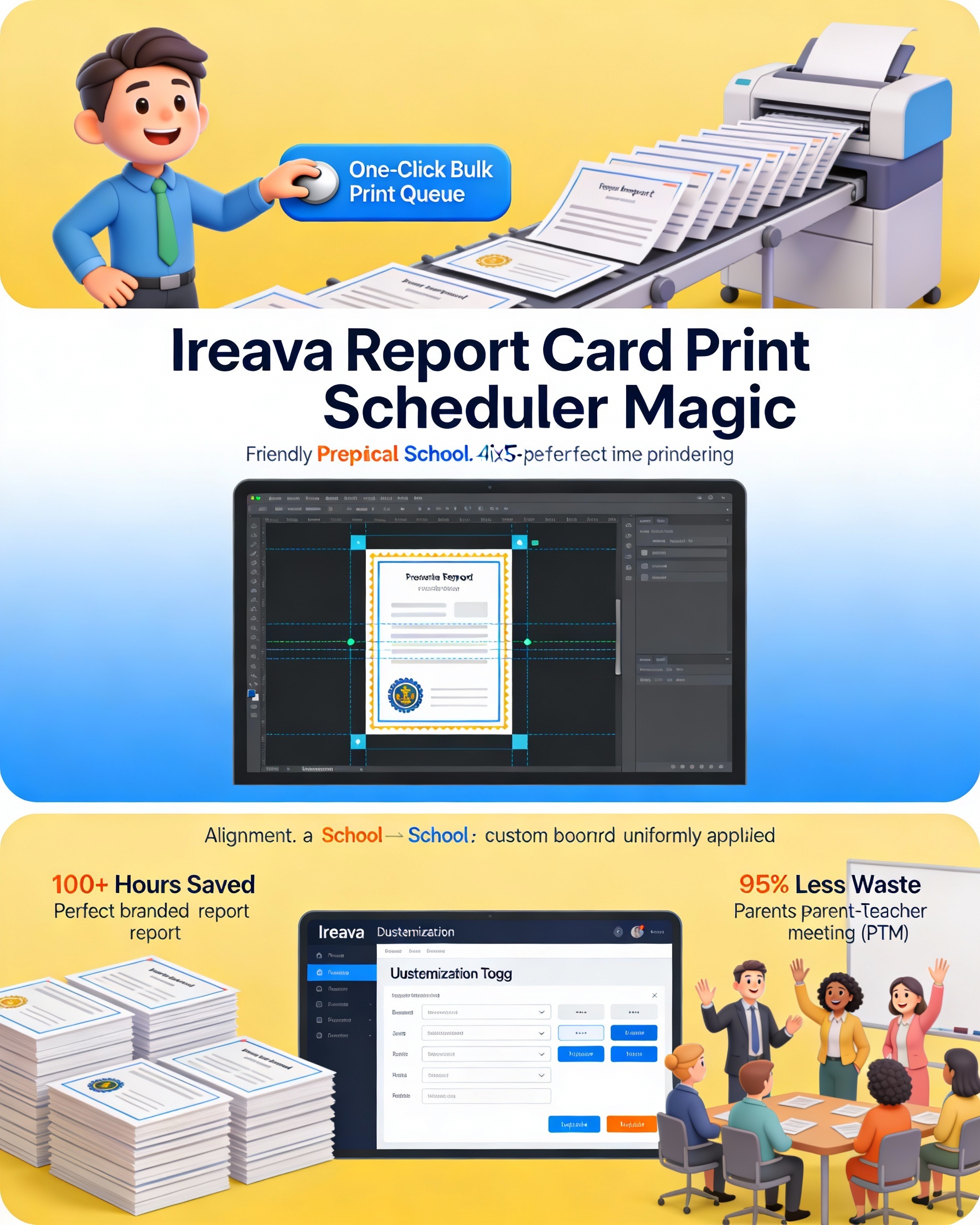 For most schools, the final step of generating report cards—the physical printing—is a multi-day, stressful process riddled with technical glitches, paper wastage, and manual effort. One of our partner institutions was spending over 100 staff hours per exam cycle just managing the printing and alignment of hundreds of student report cards. By implementing Ireava’s Report Card Print Scheduler, the school completely automated this workflow. This single feature eliminated printing delays, ensured 100% brand consistency with custom watermarks and borders, and reclaimed over 100 valuable hours for their academic staff, turning a logistical nightmare into a simple, one-click process.